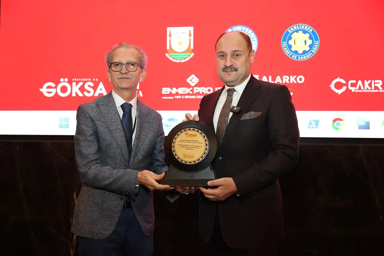 TMMOB Yürütme Kurulu Üyesi Arif Balkana, Urfa Kent Sempozyumu’na sağladığı katkılardan dolayı Şanlıurfa Büyükşehir Belediye Başkanı Mehmet Kasım Gülpınar’a teşekkür plaketi takdim etti.