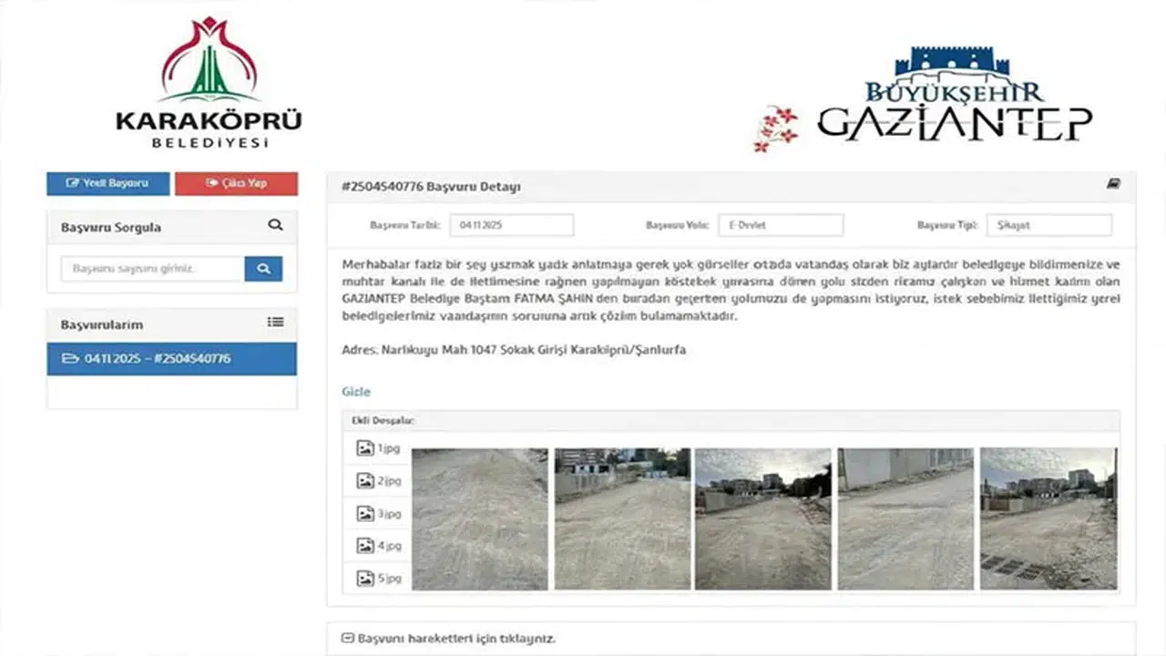 Başvuruda, yolun bozuk durumda olduğunu gösteren fotoğraflar da yer aldı. Bu fotoğraflar, durumun ciddiyetini ve gerekliliğini ortaya koyan güçlü kanıtlar niteliği taşıyor. Hizmet eksikliğine olan tepki, vatandaşı bu yola başvurmaya itti. Yolların kendi mahallerindeki görünümü, günlük yaşamı olumsuz etkiliyor ve bu durum halkın hem sağlığını hem de güvenliğini tehdit eder hale geldi. Vatandaş, bu sorunların bir an önce çözülmesini istemekte ve herkesin güvenli bir ortamda yaşamayı hak ettiğini belirtmektedir. Gaziantep Büyükşehir Belediye Başkanı Fatma Şahin'den destek talep ederken, sosyal medyadan da konunun duyurulması ve bu sorunlar üzerinde daha geniş bir farkındalığın oluşturulması gerektiğini düşünüyor.